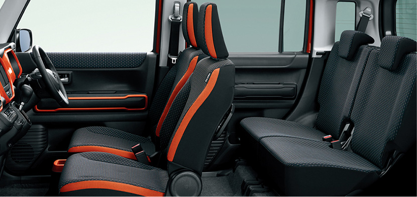 後席は左右独立タイプではなく、背もたれを前に倒すことしかできないダイハツ タフト。
