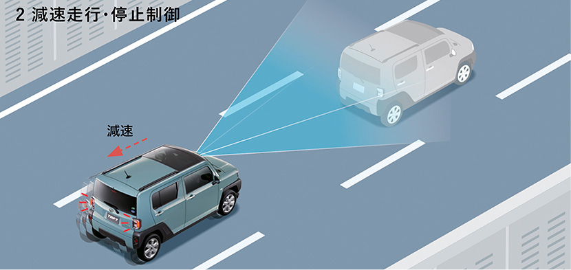 ダイハツ タフトは電動式パーキングブレーキを採用しているため、渋滞などで先行車が停止しても追従は保たれ、停車時間が長くなるときはパーキングブレーキが自動的に作動します。