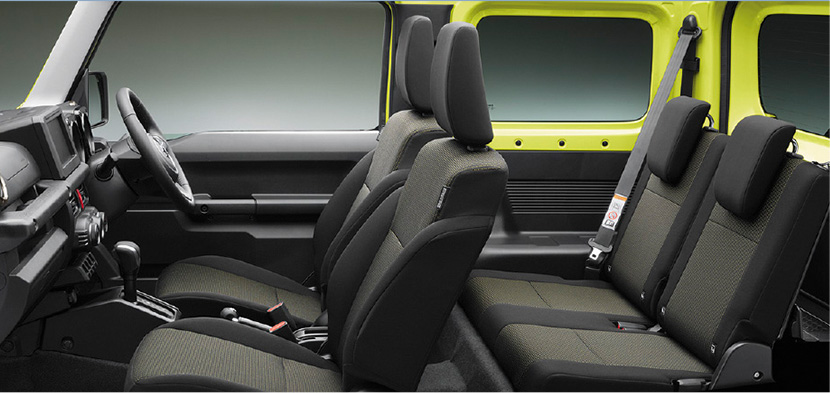 ジムニーのキャビンスペース。ドア数はリアゲートを入れて3枚のみで、後席も決して広くはない。