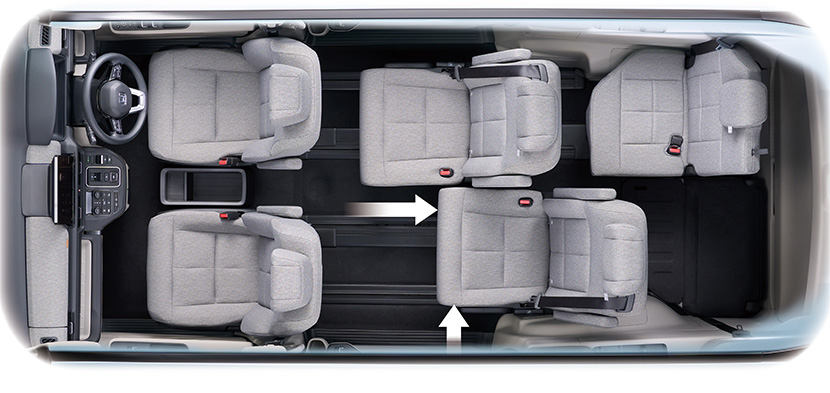 7人乗り仕様の2列目キャプテンシートは、最大865mmの前後ロングスライド機能付き。このほか、2列目がベンチシートになる8人乗り仕様もラインナップされている