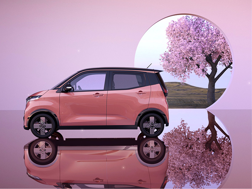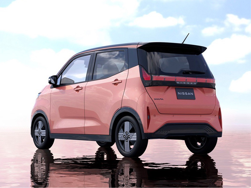 専用デザインをまとう日産 サクラ。ホイールなどには日本の「水引」を引用したデザインが採用されている。