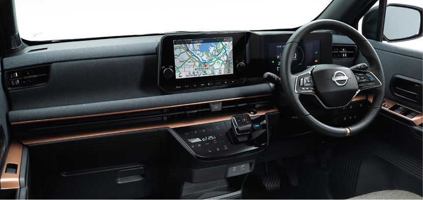 2つの液晶ディスプレイを水平方向にレイアウトした日産 サクラのインパネまわり。なかなかしゃれている。