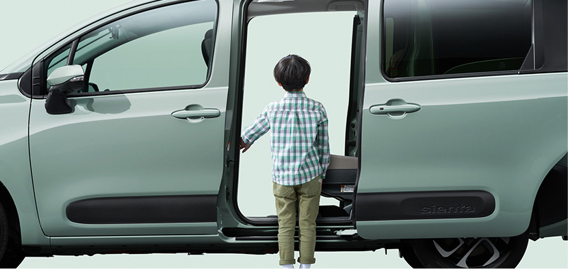 また2列目への乗り込み口は地上高330mmと非常に低く、センターピラーの「乗降用リヤアシストグリップ」は下側部分に指がかかりやすい形状となっているため、お子さんや年配の方でも容易に、安全に、乗降ができるつくりになっています。