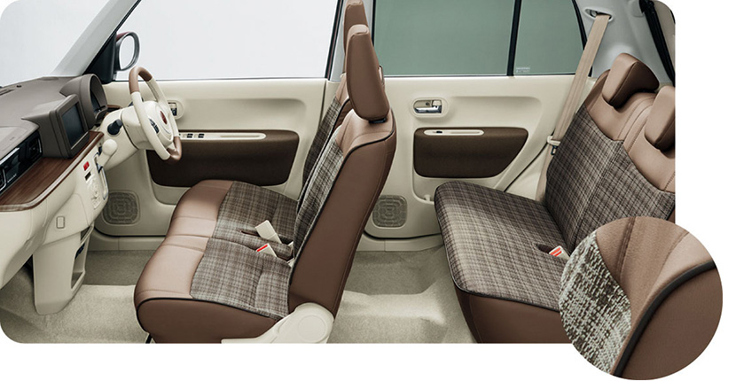 インテリアはグレードによって2種類の仕様に分かれますが、いずれもシックなオフホワイトとブラウンを基調とした「過剰に女性っぽくはない可愛さ」にあふれていて、グレンチェックに近いチェック柄のシートも絶妙です。