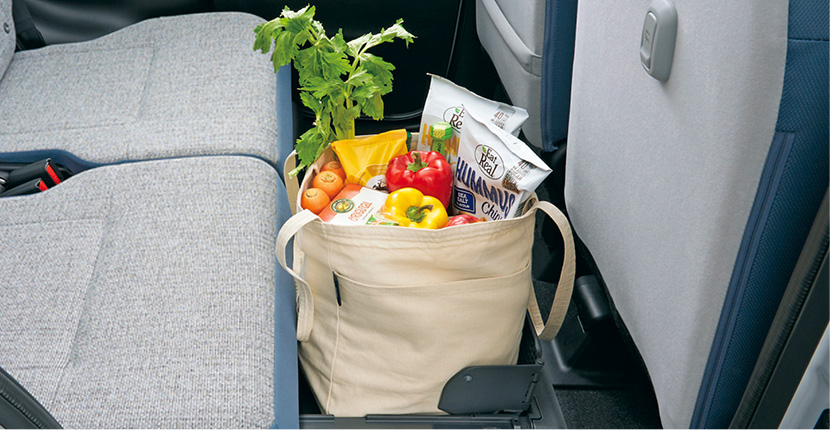 またダイハツ ムーヴ キャンバスは、フロアに直接置きたくない荷物の収納に便利な「置きラクボックス」という機能が、初代モデルの頃からリアシートの下に付いていますが、現行型ではそれがさらに進化。倒れたら困る食料品などを固定できる「バスケットモード」も、片手によるワンアクションで組み立てられるようになっています。