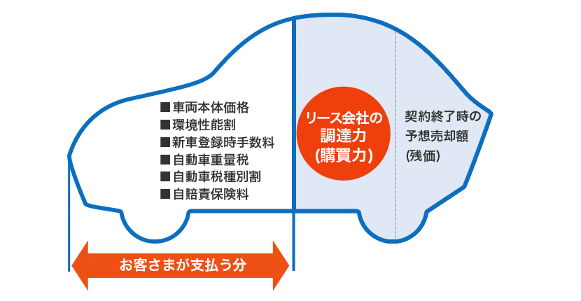 契約者へ車を貸し出すにあたっては、車両本体価格の全額をリース料に含めてはおらず、貸し出す期間に応じその満了時に残っていると想定される車の想定市場価値(残存価格)を差し引いています。