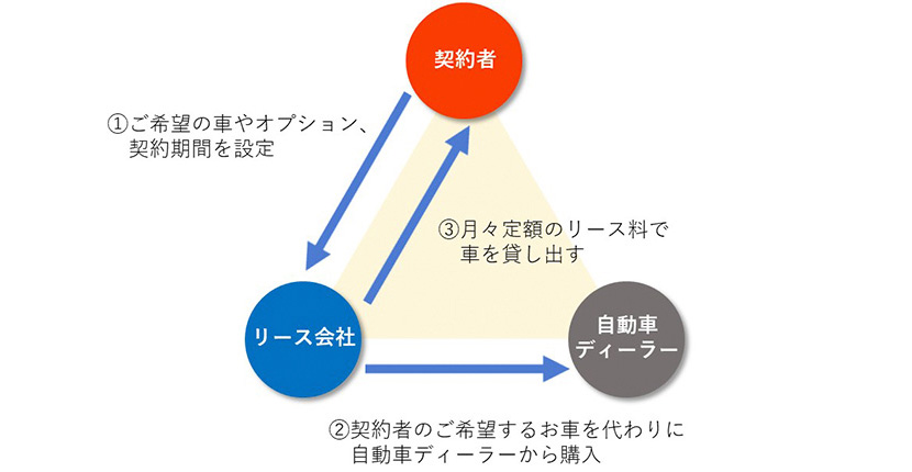 カーリースは、ご希望の車やオプション装備、契約期間を契約者が設定し、その車をリース会社が契約者に代わって自動車ディーラーから購入し、あらかじめ設定した契約期間、月々定額のリース料で契約者へ車を貸し出す、というしくみになっています。