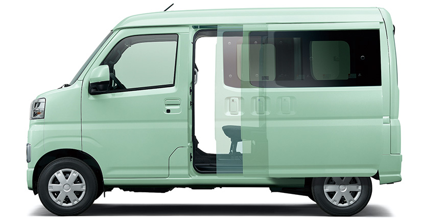 また、これは当たり前の話かもしれませんが「スライドドアが付いている」というのも、軽バンの便利なポイントです。車の後部空間の作りがシンプルでフラットであるということと併せ、同じようにスライドドアを備えている軽スーパーハイトワゴン以上に楽々と、荷物の出し入れを行うことができます。