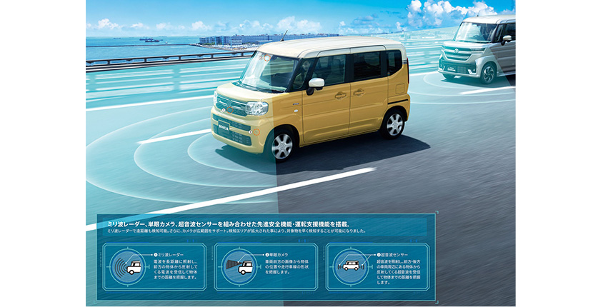 新型スペーシア/スペーシア カスタムは先進安全装備の内容も大いに充実しています。