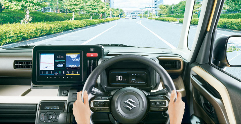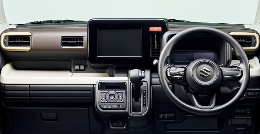 合計3つのUSBポートやドアパネル上部のスリット状の小物入れ、メーターフード上部にはオープントレイを配置し、電動パーキングブレーキを採用するなど、新型スペーシアは装備面も強化。デジタル式のスピードメーターと、カラー化したマルチインフォメーションディスプレイを組み合わせたメーターパネルも印象的です。