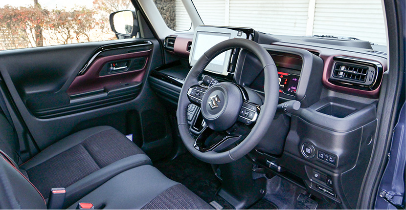 一方のスペーシア カスタムは「ホテルのラウンジのような室内空間を志向した」とのことで、セミマットのボルドーとピアノブラックの樹脂で全体をコーディネート。シート表皮はボルドーとブラックを組み合わせたファブリックを中心に、上位グレードでは一部に合皮が採用されています。