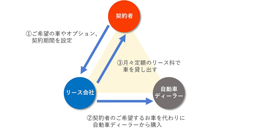 リース会社が契約者に代わって車を購入し、契約者はそれに応じたリース料を支払うことでその車をリース会社から借り、自身の車として使うことができるというしくみになっています。