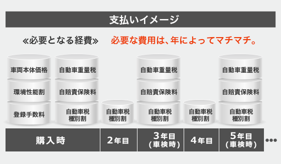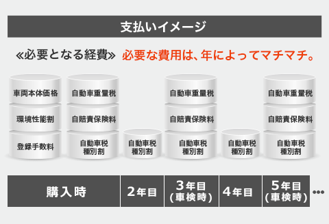 - ■「ファイナンスリース」:車両本体価格・環境性能割・新車登録時の諸費用・自動車税種別割(期間分)・重量税(初回のみ)・自賠責保険料(初回のみ)
